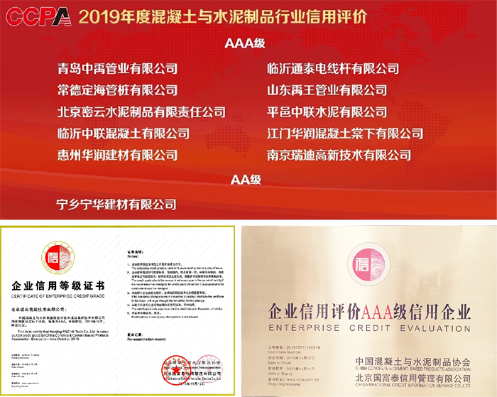 | 我公司获评2019年混凝土与水泥制品行业“企业信用评价AAA级信用企业” | |