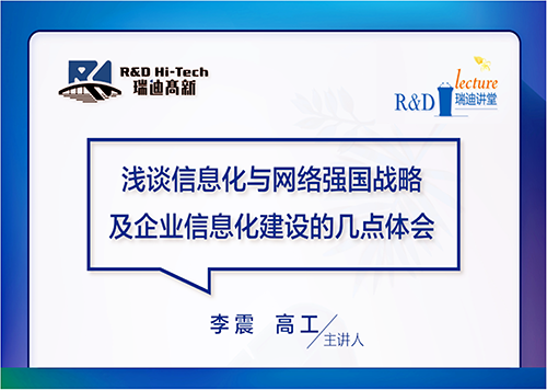 为深入贯彻习近平总书记网络强国战略思想,全面推进公司网络安全和信息化工作,2020年4月15日,在“全民国家安全教育日”5周年之际,特邀南京水利科学研究院院办副主任李震走进瑞迪课堂,做专题培训辅导报告。本期课堂由公司党支部书记、副总经理祝烨然主持,公司董事长、总经理徐志峰、相关部门负责人及技术骨干20余人参加。 李震副主任以《浅谈信息化与网络强国战略及企业信息化建设的几点体会》为题,系统阐述了国内外信息化发展历程、网络强国战略思想及企业信息化建设要点,和与会人员就网络安全、公司信息化建设、公司技术资料安全管理面临的具体问题进行了答疑和交流。 徐志峰董事长在总结中指出,国家安全涉及到方方面面,公司正处于转产期,在密切关注生产安全、搬迁安全的同时,还应加强对信息安全的认识。李震副主任的讲座内容丰富、案例生动,对公司推进信息化建设具有极强的指导性,信息化建设是推动和实现企业制度创新、技术创新、管理创新的重要手段和必由之路,本次讲座既是培训也是动员,公司各部门要提高认识,明确责任,将工作流程、管理需求、审批表单等进行梳理和汇总,按照公司信息化建设要求积极开展工作,确保完成年度信息化建设目标。