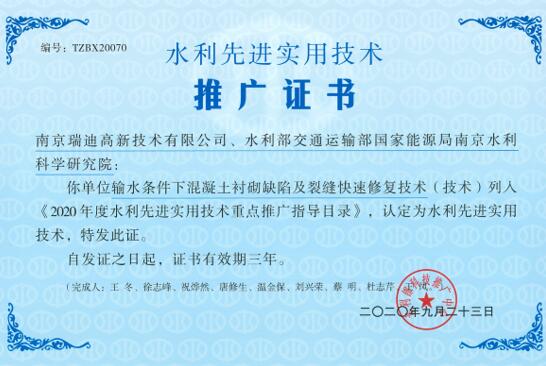 水利部办公厅为加快推进水利科技成果转化,开展了成熟适用水利技术成果评选活动。公司“输水条件下混凝土衬砌缺陷及裂缝快速修复技术”参加了此次评选,经严格筛选,该项成果成功列入《2020年度水利先进实用技术重点推广指导目录》,被认定为水利先进实用技术。